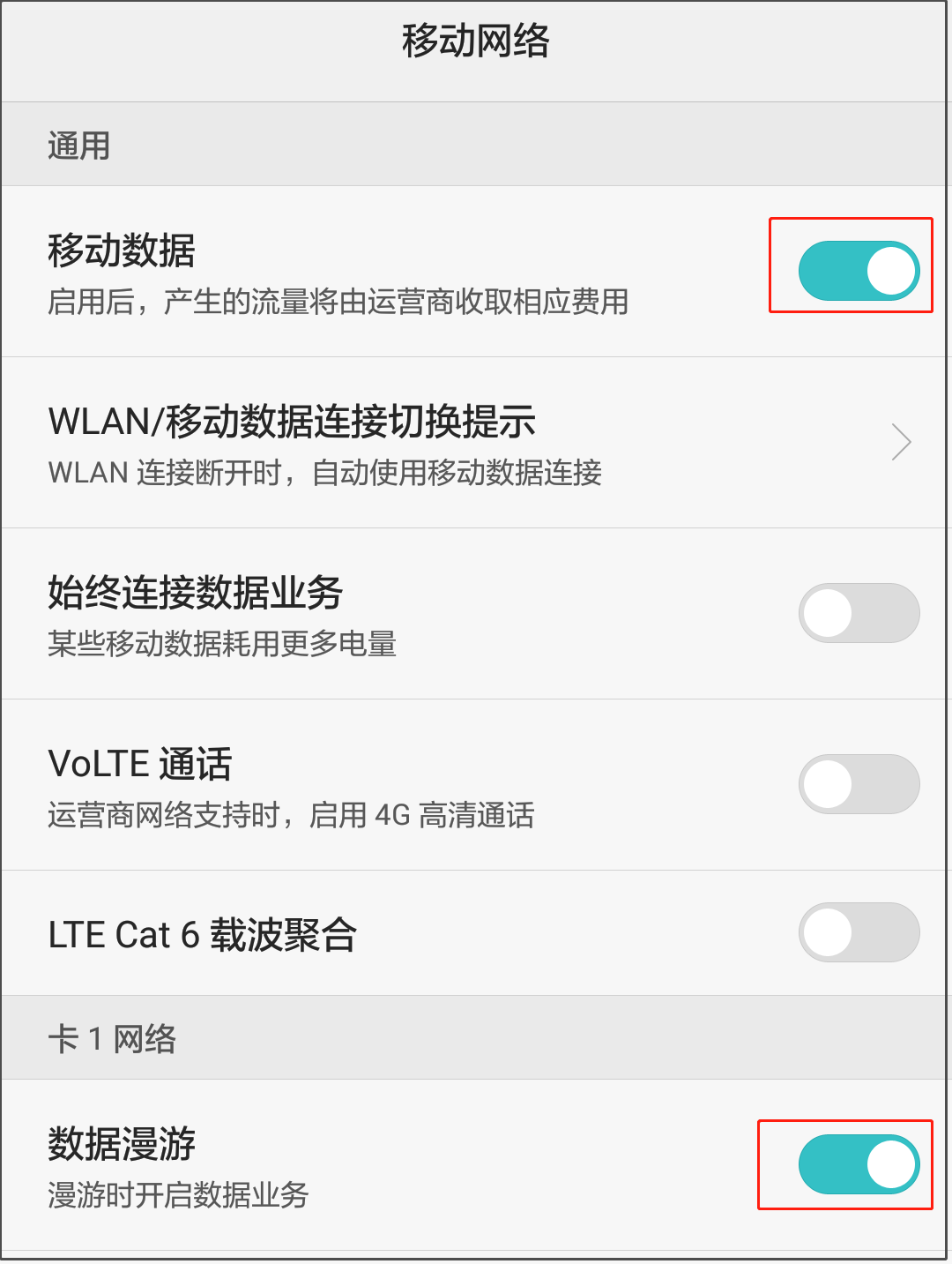 安卓(Android)手机检查步骤: 打开手机【 设置 】—点击【 移动网络 】—启用【 移动数据 】、【 数据漫游 】