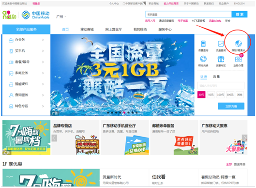 (1)登录中国移动官方网站并点击【 国际/港澳台 】页面。