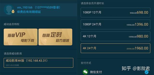 续费价格我们可以从APP的续费菜单中看到,目前以4K服务为例,一年期为980RMB,两年期为1960RMB