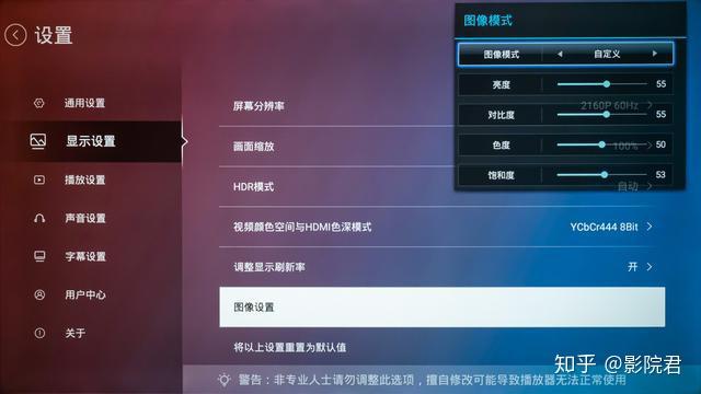 在“图像模式”里可对画面进行比较细致的调整,如自定义对亮度、对比度、色度、饱和度等参数进行微调,我们也选用预设的方案如电影、鲜艳、运动等。