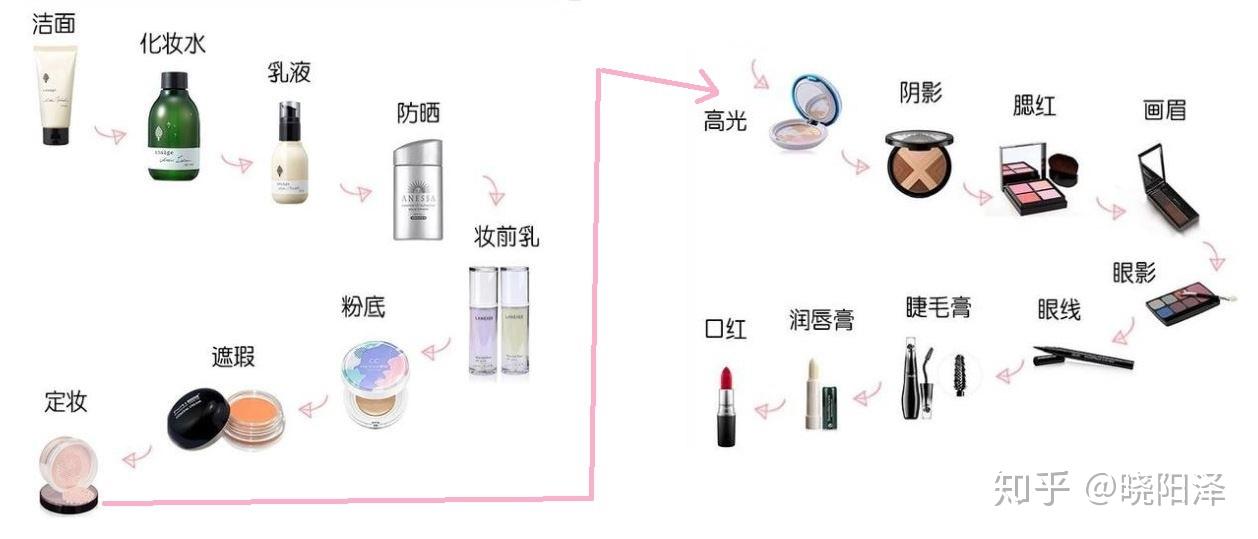 话不多说,先来上个图,看完下图,我也是心累了,太复杂了,可是没办法,完整的上妆过程就是下图所示,不过大家还是要根据自己的适用情况和所有产品进行自我选择,但是适用的顺序不会变化,可能根据个人不同会省略下图的部分产品。
