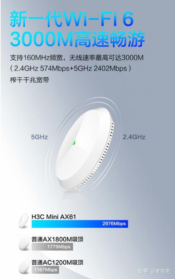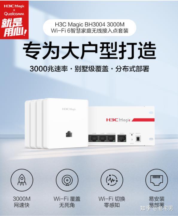 华三(H3C) Magic BH套装,面板ap为AX3000,无线速率为AX3000,2.4Ghz频段为2X2 574Mbps,5Ghz频段为2X2 2402Mbps,支持160Mhz频宽。
