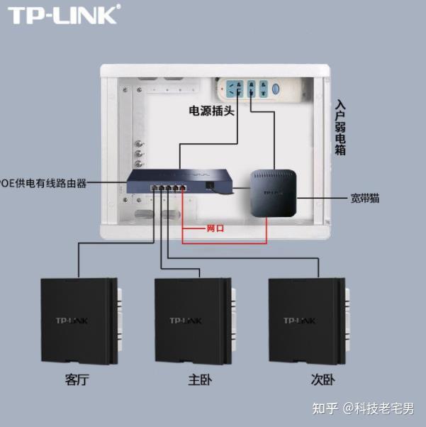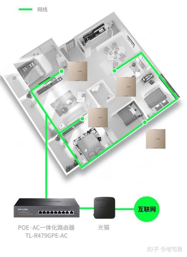 面对一般家用场景,POE供电 · AC一体化路由 + 面板AP就能满足需求,网络拓扑结构为:光猫 - 一体化路由 - 面板AP,各个面板AP由一体化路由通过POE方式供电,不用另外接电源。组网则是在一体化路由的WEB页面统一设置,