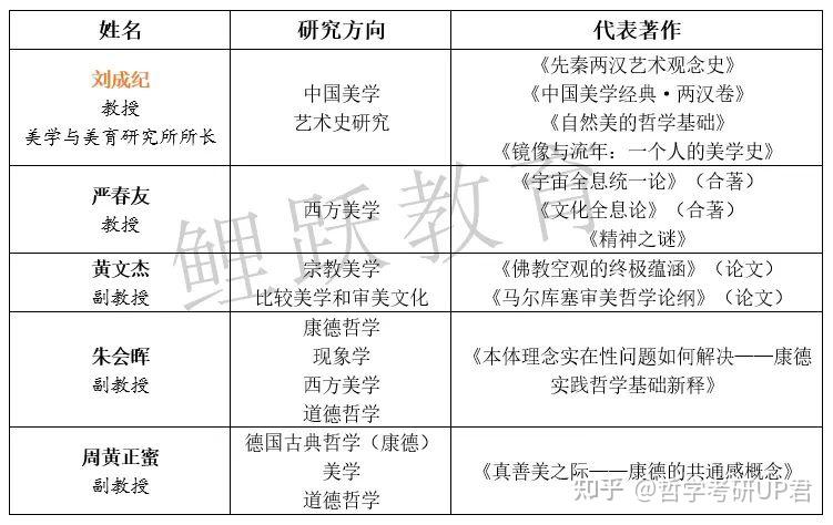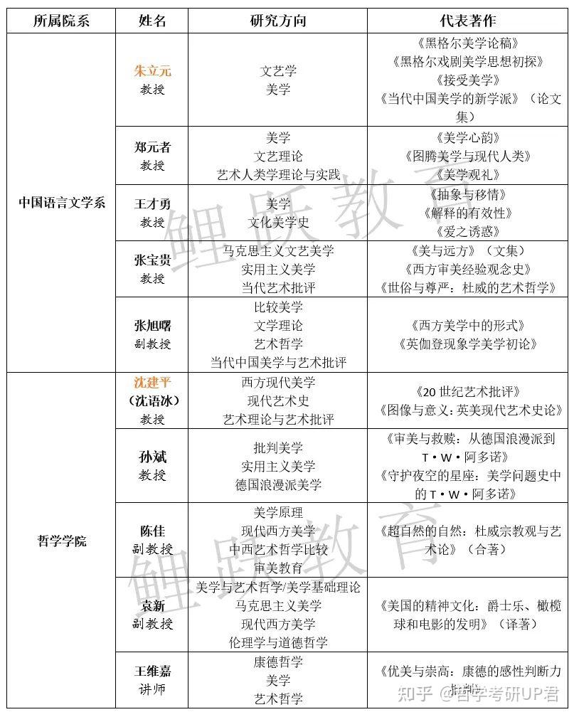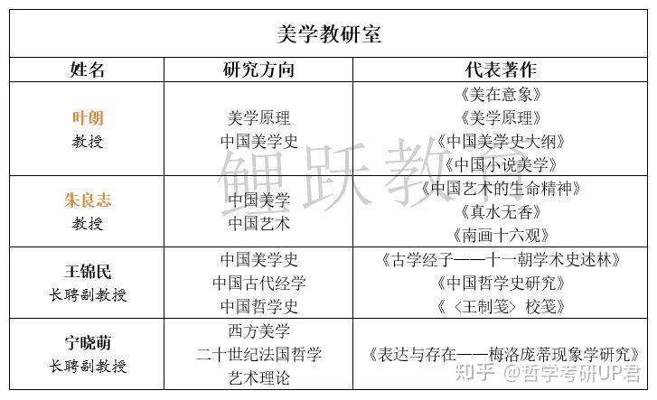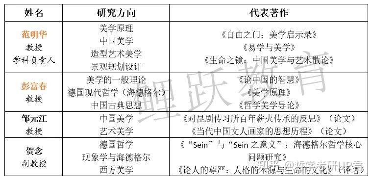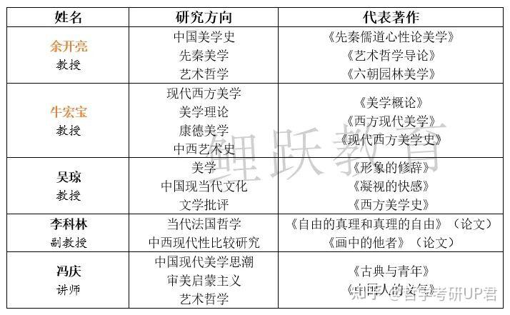 (3)师资力量: 人大美学方向师资实力不俗,中国美学方向现由张法先生门生 余开亮 领衔,西方美学也有 牛宏宝 先生坐镇,参看下表: