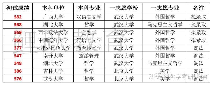 武大关于调剂生的情况列得很清晰,可以看到,他们更倾向于本校 哲学系内调剂 的考生。有两名调剂生即使本科背景好,但一志愿学校是北大,都没有被录取。但我们也可以看到,武大 对本科背景并不是很看重 ,跨考生完全不用担心的~
