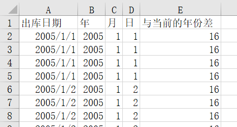 例22:在ChuKu中筛选出出库日期,并展示它的年份,月份,日期,出库日期与当前日期的年份差。