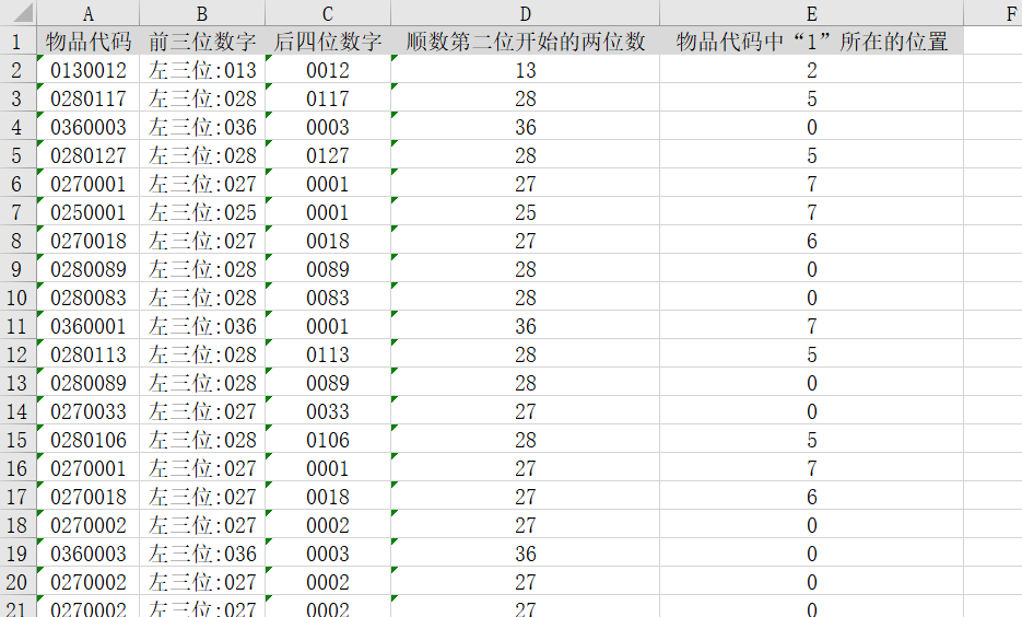 例21:在ChuKu中筛选出物品代码,并展示它的前三位数字,后四位数字,顺数第二位开始的两位数,物品代码中“1”所在的位置。