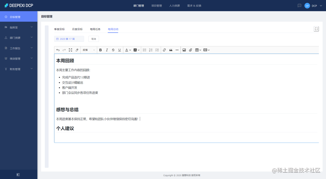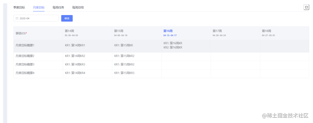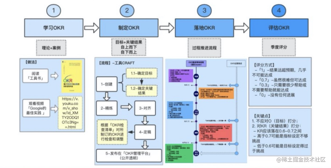 保持每周做回顾,每个 成员 在每个周一需要确定自己本周的OKR,在一周结束后需要根据自己这周的工作完成情况梳理进度,并对项目情况进行总结与建议。