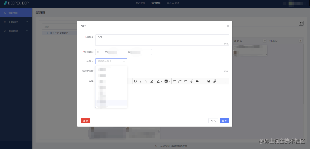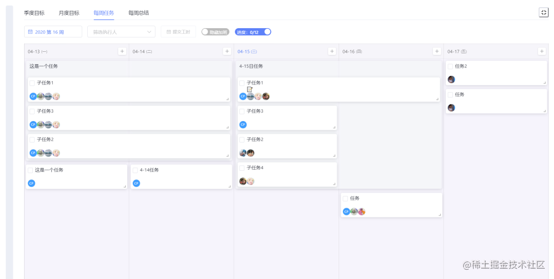 查看本周被分配的任务与自主创建个人任务。任务支持进度更新,使