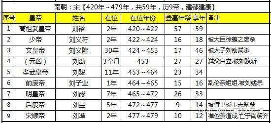 从图片可以看出,刘宋在位时间最长的皇帝是宋文帝,共在位29年,而宋孝武帝在位12年,位居第二。其余皇帝除了明帝外,在位时间都在3年以内,可以看出刘宋的皇位继承和朝政异常混乱。用一句话概括刘宋的皇帝,那就是“昏君特别多。”除了刘裕和刘义隆,我认为其余皇帝都可以称之为昏君。