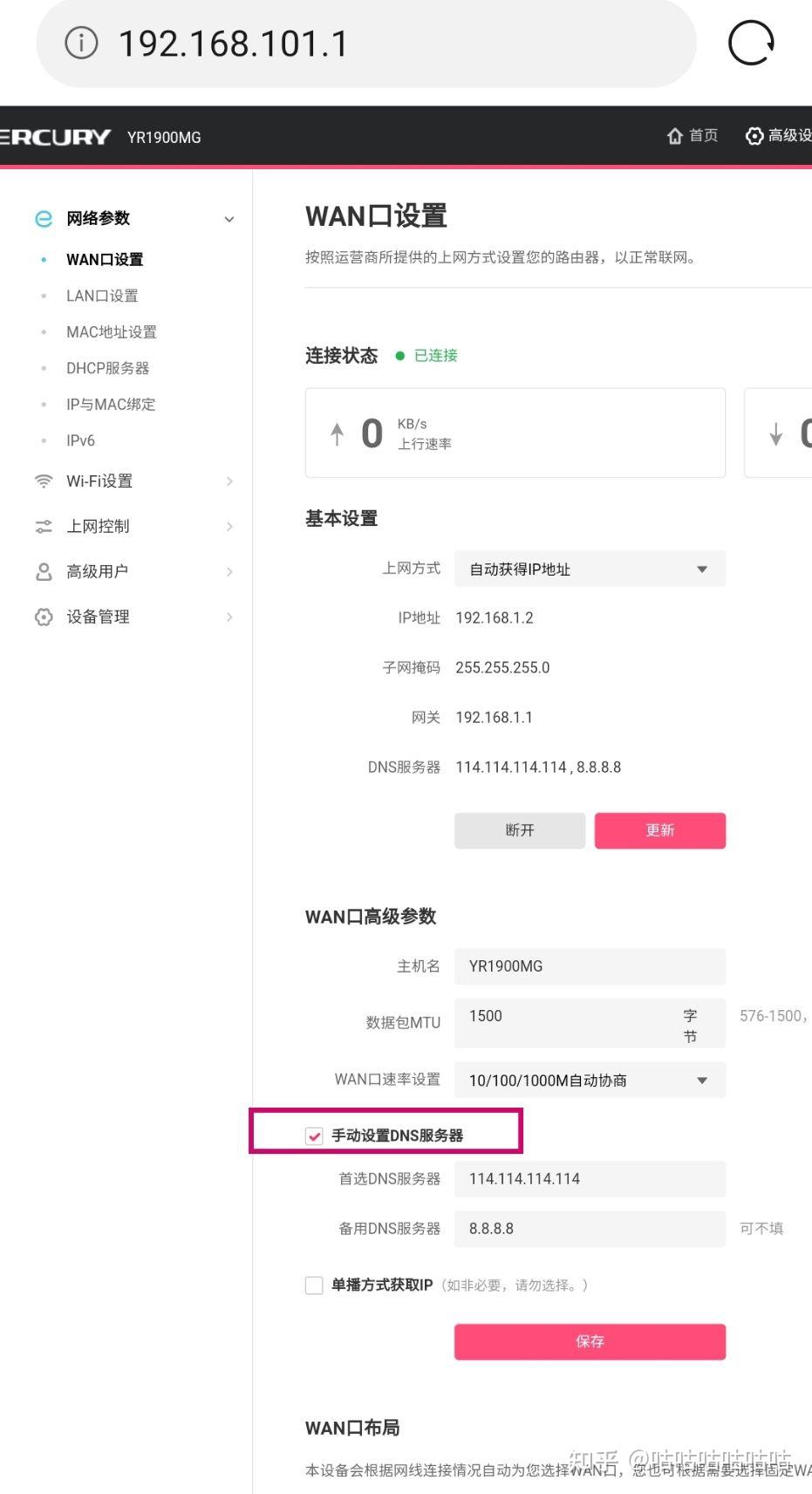 点上边的高级设置,进去找到手动设置dns打勾输入dns服务器域名然后保存即可(不同的路由器设置的位置不一样,多找一下肯定能找到)。