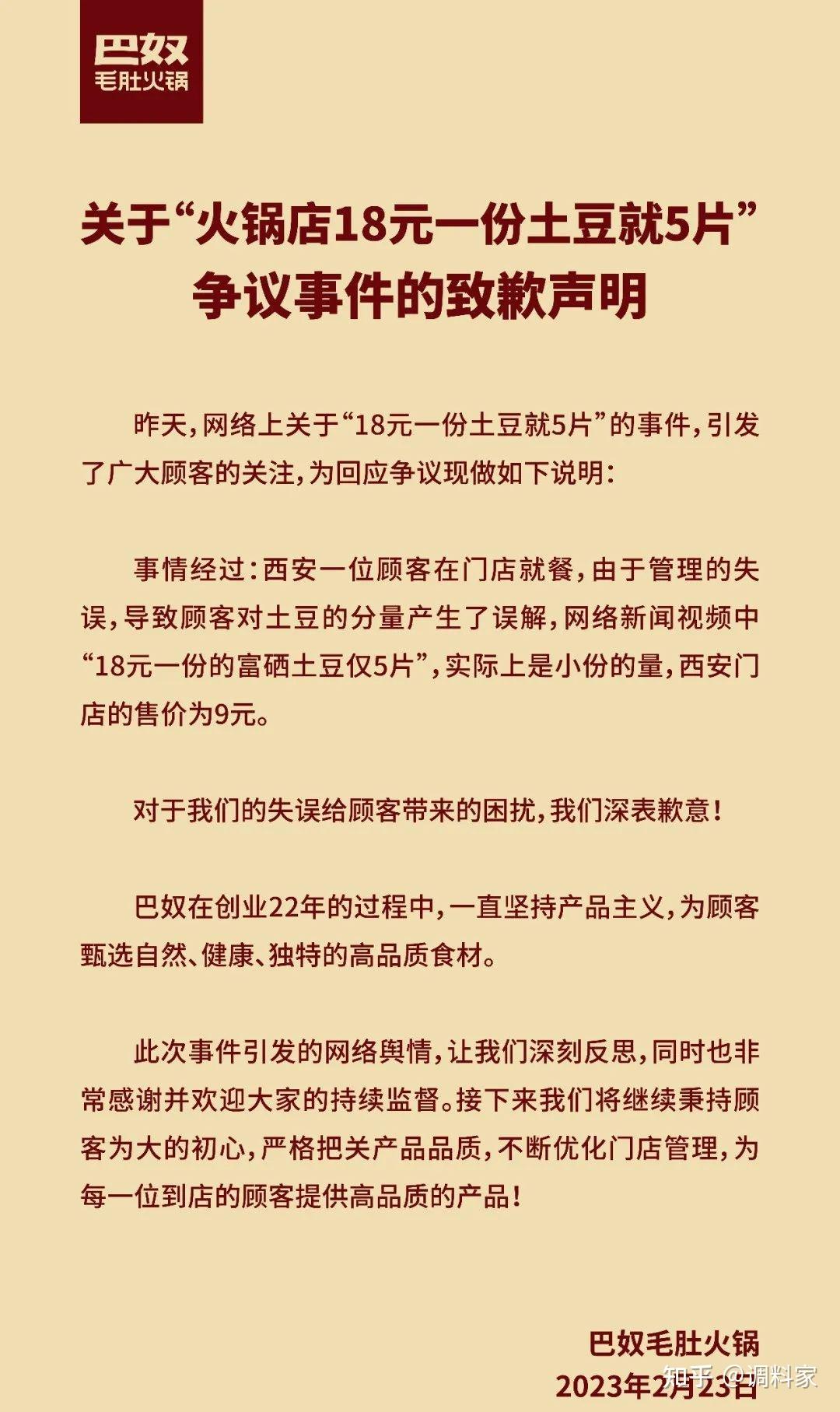 而巴奴也通过官方微信发布了关于“火锅店18元一份土豆就5片”争议事件的致歉声明。并表示该顾客点的是小份,在西安门店的售价为9元。
