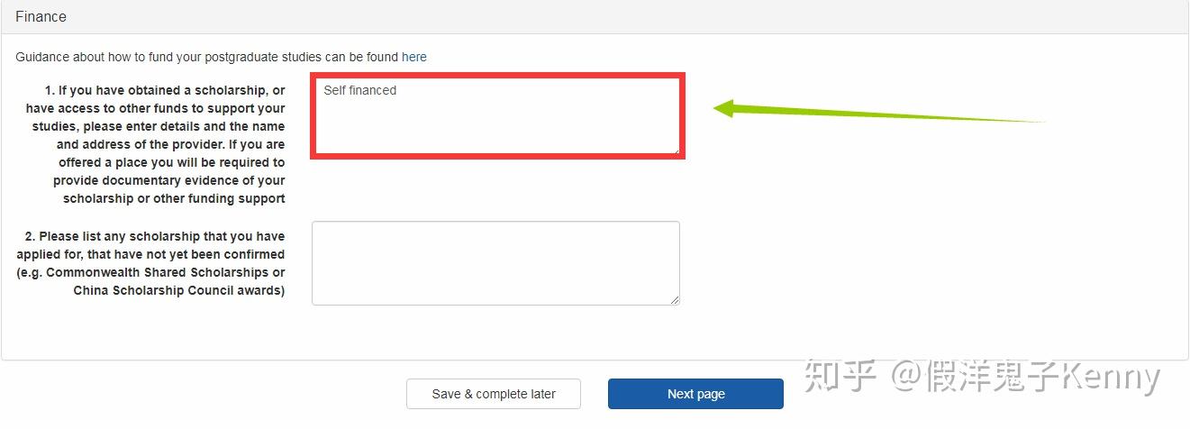 这里,如果你没有奖学金的话,填写 Self financed 即可,然后点击 Next Page