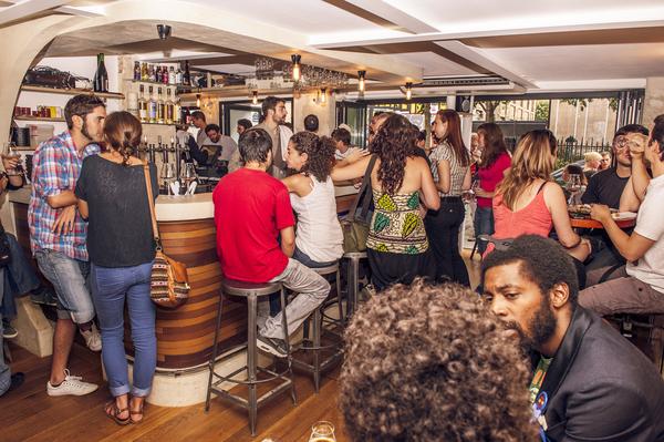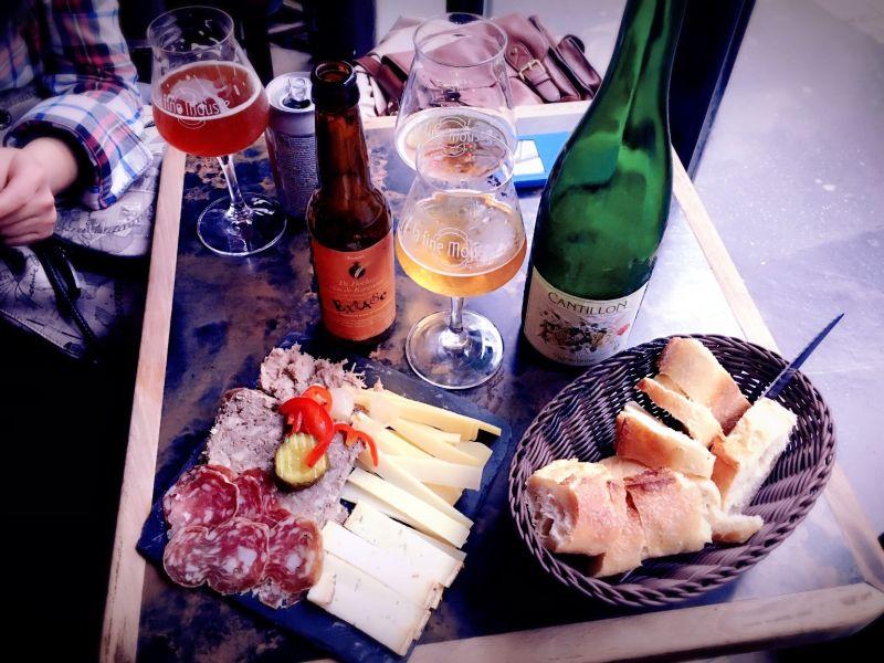 周六和几个朋友一同去了巴黎最好的精酿啤酒吧 la fine mousse 。这个小酒吧位于la place de République附近,面积不大,只有一个吧台,几个桌子,几个皮椅子,装修风格是典型的法式乡村风格。酒吧下午5点开门营业,我们一行人6点到,里面已经是坐满了人,混着嘈杂的音乐,每个人拿着高脚杯一口一口的喝着不同颜色的啤酒。