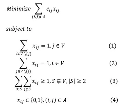 而进一步当没有容量和时间等约束且仅有一辆货车进行一次性补货时,该问题就是TSP问题,即找到成本最小的一条闭迹遍历已知的点集合(V), 且在最优解中所有点仅会出现一次。