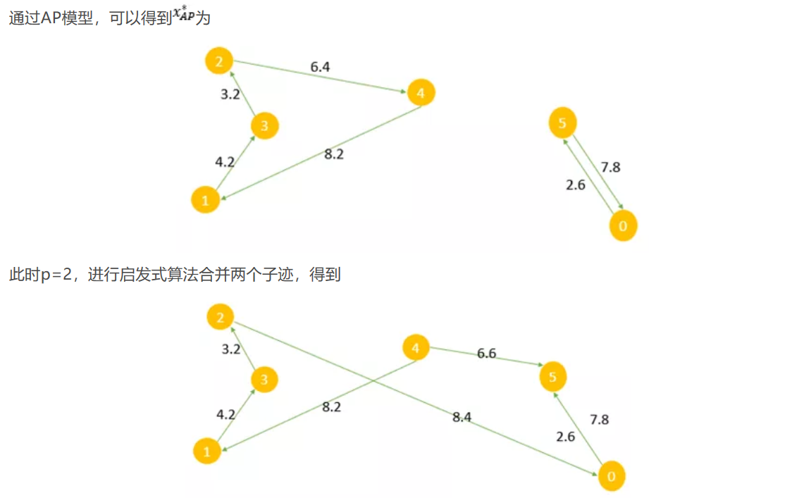 在上述简单例子中,由于AP初始解仅有2个闭合回路,因此我们仅需要通过一次循环就可以找到启发式算法的最优解, 更一般而言,当初始解回路为M时,我们需要重复M-1次以得到最优解。