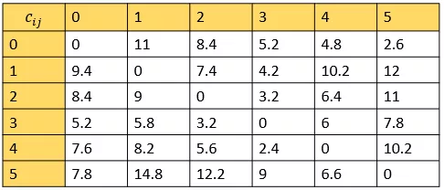 我们可以通过以下具体例子[2]进一步理解,假设有6个点,每个点之间的距离成本矩阵如下