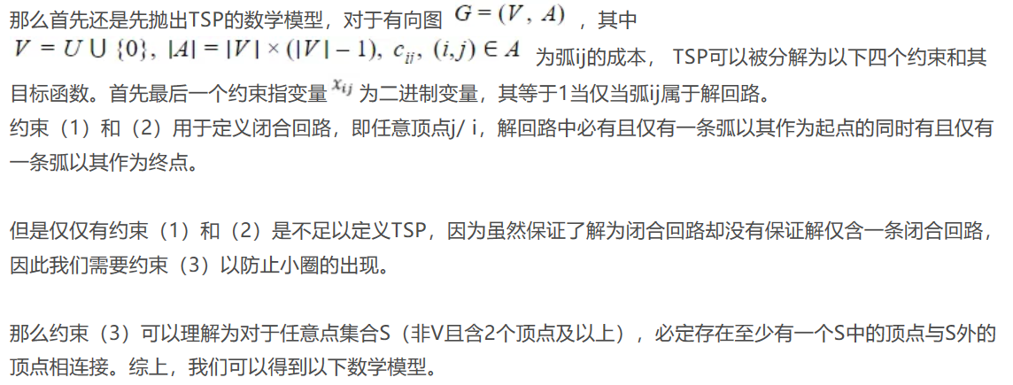 TSP全称为Travelling Salesman Problem(旅行商问题),通俗而言,它是指对于给定的一系列城市和每对城市之间的距离,找到访问每一座城市仅一次并回到起始城市的最短回路。
