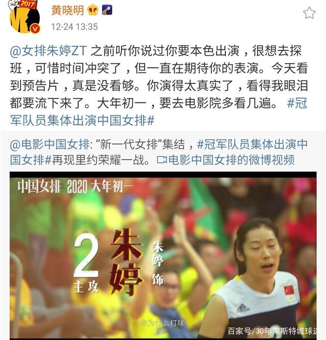 朱婷的偶像、著名男演员黄晓明,通过观看电影《中国女排》的一个宣传片,就被大婷的演技看哭,他表示:“看到预告片,真是没看够。你演得太真实了,看得我眼泪都要流下来了。大年初一,要去电影院多看几遍。 ”连黄晓明这样的资深演员都被朱婷的演技所征服,那看来大婷还很有演戏天赋的。