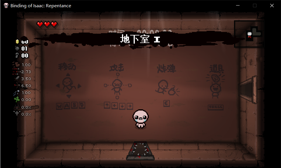 进入游戏后,可以看见这个画面。背景的地面告诉了我们基本操作(wasd键是移动,上下左右键是攻击及方向,e键是放置炸弹,空格键是使用主动道具,q键是使用道具和卡牌,tab键是显示大地图,层数,分数,时间等)