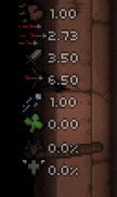 左边记录了你的属性(从上往下:移速,射速,攻击,射程,弹速,幸运,恶魔房开房率,天使房开房率)