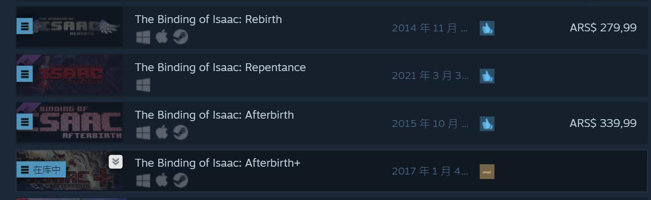 在steam中搜索 “isaac” 会出现如图的4个游戏。第一个是游戏的本体,也就是重生,第二个是最新的忏悔dlc,第三个是胎衣dlc,第四个是胎衣的dlc胎衣+