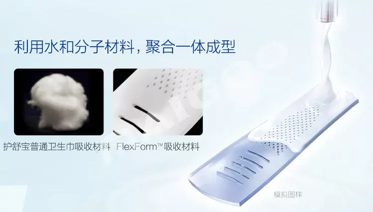 和普通的棉质卫生巾对比,液体卫生巾对内芯材料做了创新:利用高压液相乳液聚合技术一体成型FlexFoam™吸收材料,这种吸收材料 能将血更彻底地吸收到底部 。