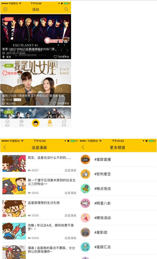 5个频道,其中星动态可以切换自己喜欢的明星,看爱豆微博的动态,满足用户想时刻了解爱豆形成动态的需求