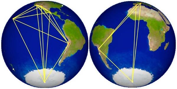事件视界望远镜由位于四大洲的射电望远镜所组成,图中的黄色线条为连接这些望远镜的“基线”,由此构成了一架和地球大小相当的望远镜。图/EHT