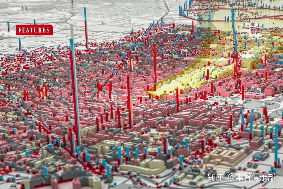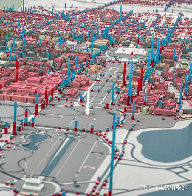 上图是一个多主体仿真模型的快照。其中,白宫附近的一枚核弹熄灭几小时之后,一股放射性尘埃(黄色)向东延伸到华盛顿特区。图中柱状体的高度表示一个地点的人数,颜色表示人们的健康状态,蓝色表示健康,红色代表疾病或者死亡。
