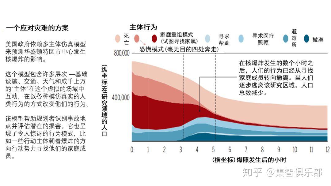 六十年后,官员们仍然在定期的 NPS1演习中考虑核灾难的后果。只是现在,他们没有按照固定的故事线和提前对核袭击下人类行为进行预判来进行演习,而是使用计算机来模拟整个人工社会的情景: 这是一种叫做多主体仿真模型(agent based model)的先进的计算机仿真方法。