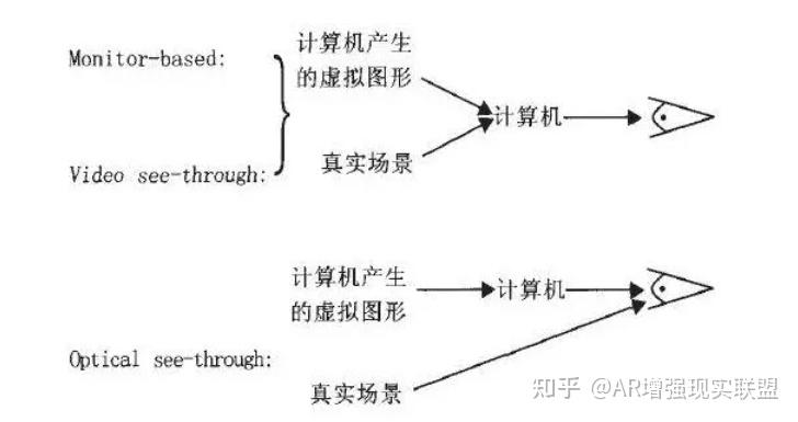 三种系统结构的性能比较 三种AR显示技术实现策略在性能上各有利弊。在基于monitor-based和video see-through显示技术的AR实现中,都通过摄像机来获取真实场景的图像,在计算机中完成虚实图像的结合并输出。整个过程不可避免的存在一定的系统延迟,这是动态AR应用中虚实注册错误的一个主要产生原因。但这时由于用户的视觉完全在计算机的控制之下,这种系统延迟可以通过计算机内部虚实两个通道的协调配合来进行补偿。而基于optical see-through显示技术的AR实现中,真实场景的视频图像传送是实时的,不受计算机控制,因此不可能用控制视频显示速率的办法来补偿系统延迟。