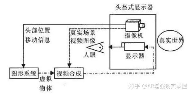 Video see-through系统 头盔式显示器(Head-mounted displays-HMD)被广泛应用于虚拟现实系统中,用以增强用户的视觉沉浸感。增强现实技术的研究者们也采用了类似的显示技术,这就是在AR中广泛应用的穿透式HMD。根据具体实现原理又划分为两大类,分别是基于视频合成技术的穿透式HMD(video see-through HMD)和基于光学原理的穿透式HMD(optical see-through HMD)。