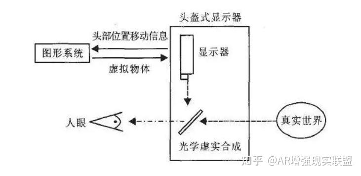 Optical see-through系统 在上述的两套系统实现方案中,输入计算机中的有两个通道的信息,一个是计算机产生的虚拟信息通道,一个是来自于摄像机的真实场景通道。而在optical see-through HMD实现方案中去除了后者,真实场景的图像经过一定的减光处理后,直接进入人眼,虚拟通道的信息经投影反射后再进入人眼,两者以光学的方法进行合成。