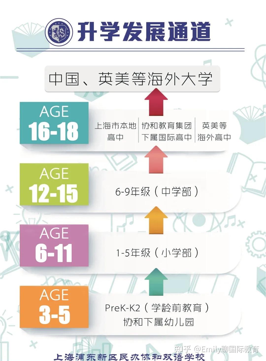 学校提供的融合课程已在小学一年级至中学各年级全面覆盖,招收了符合上海市入学条件、综合素质优良、培养目标契合的适龄学生。背靠“协和系”这棵大树,协和浦东的学生 对外招生名额不多,以直升为主 ,在升学上有非常明显的优势。主要升学路径是:海富幼儿园升入小学,小学升入初中,初中升入协和系的其它高中校区。