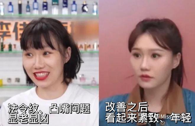 这就导致了她一笑起来,看起来有点龅牙,法令纹也非常深刻,也就是之前一直被大家诟病的: