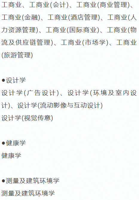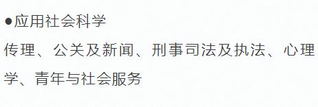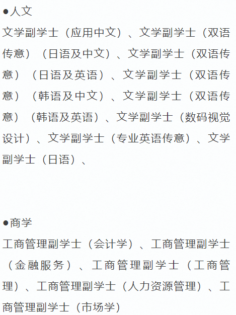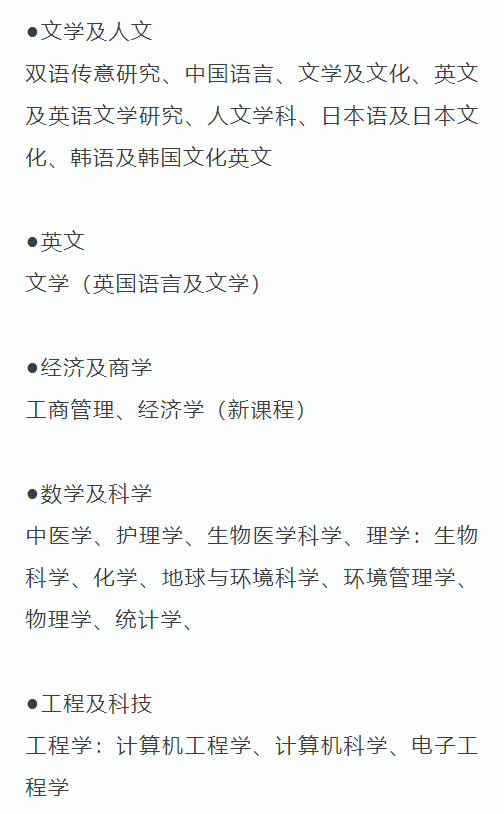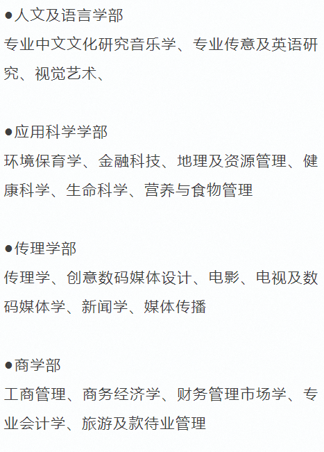 - 经济与商学: 工商管理、经济学、旅游及款待、国际商业、会计、金融、人力资源等;