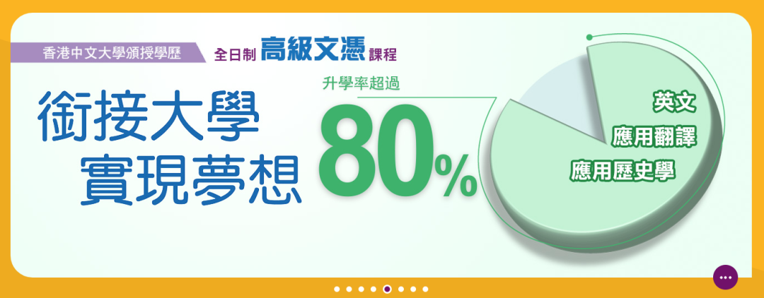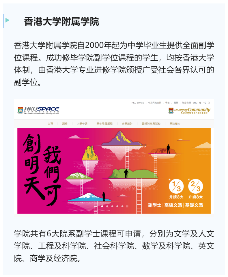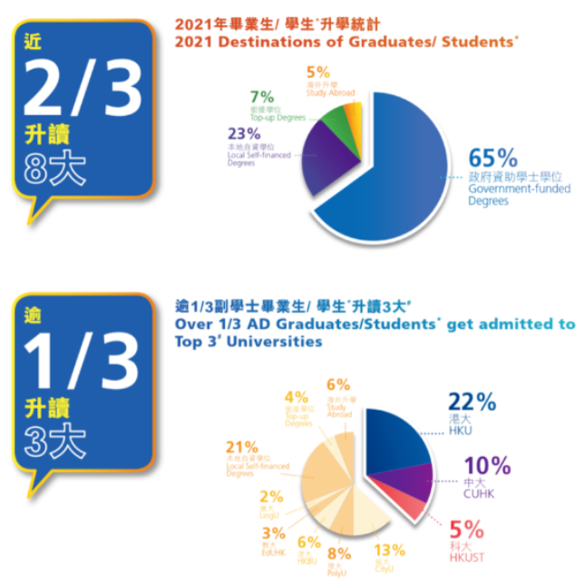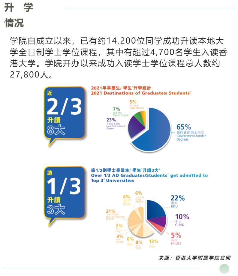 香港大学副学士的官网数据表明,有超过2/3的学生升读香港八大名校的学士学位,超过1/3的学生升读香港前三大的学士学位。