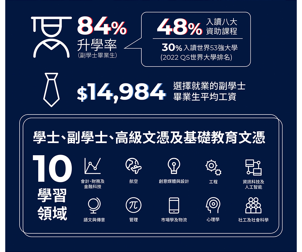 据学院统计,2021年副学士升学率为84%,其中升学入读香港八大的有48%。