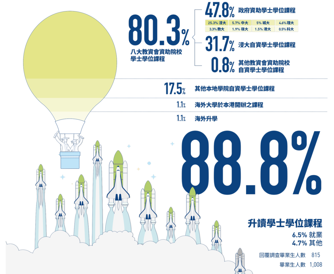 据学院统计,2021年副学士升学率为88.8%,其中80.3%升读香港八大的学士学位课程。