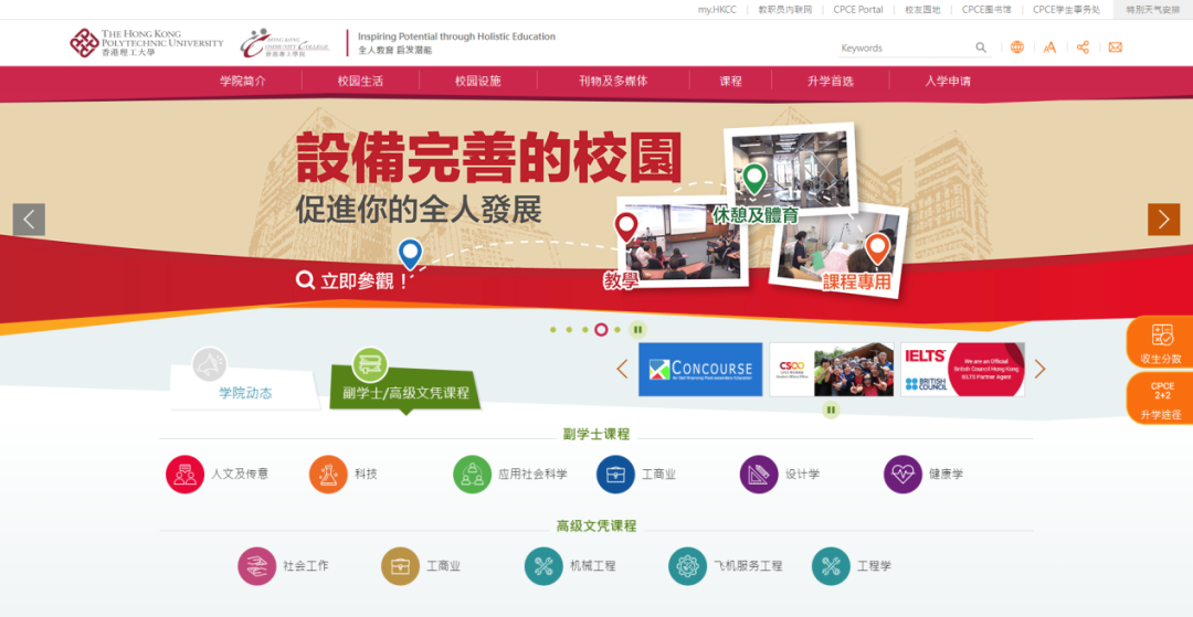 香港理工大学香港专上学院(HKCC)成立于2001年。由专业及持续教育学院管理,是香港第五家开办副学位课程的专上学院。所有课程均经过严格审批,确保课程教学素质符合理大的严格规定。