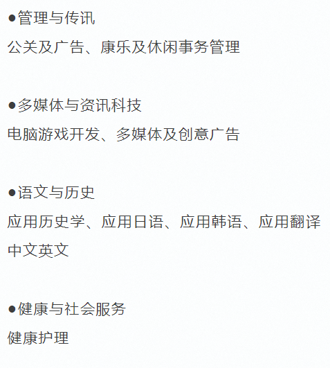 - 传媒: 媒体与文化研究、广告与传意、音乐、创意媒体与产业、新闻学、媒体传播等