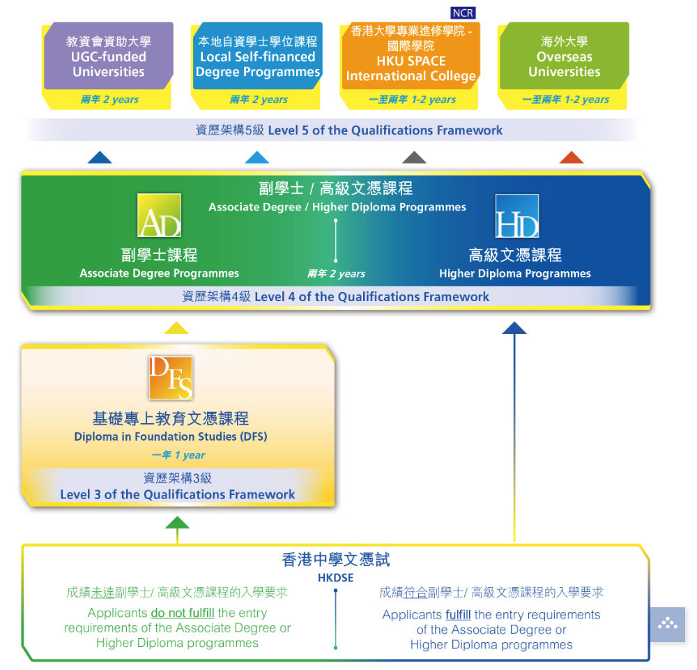 副学士或高级文凭第一年的学生亦可报读英国/澳洲大学一年级或北美及苏格兰大学二年级课程。书院开办的所有课程,均由香港大学专业进修学院上载于资历手册。