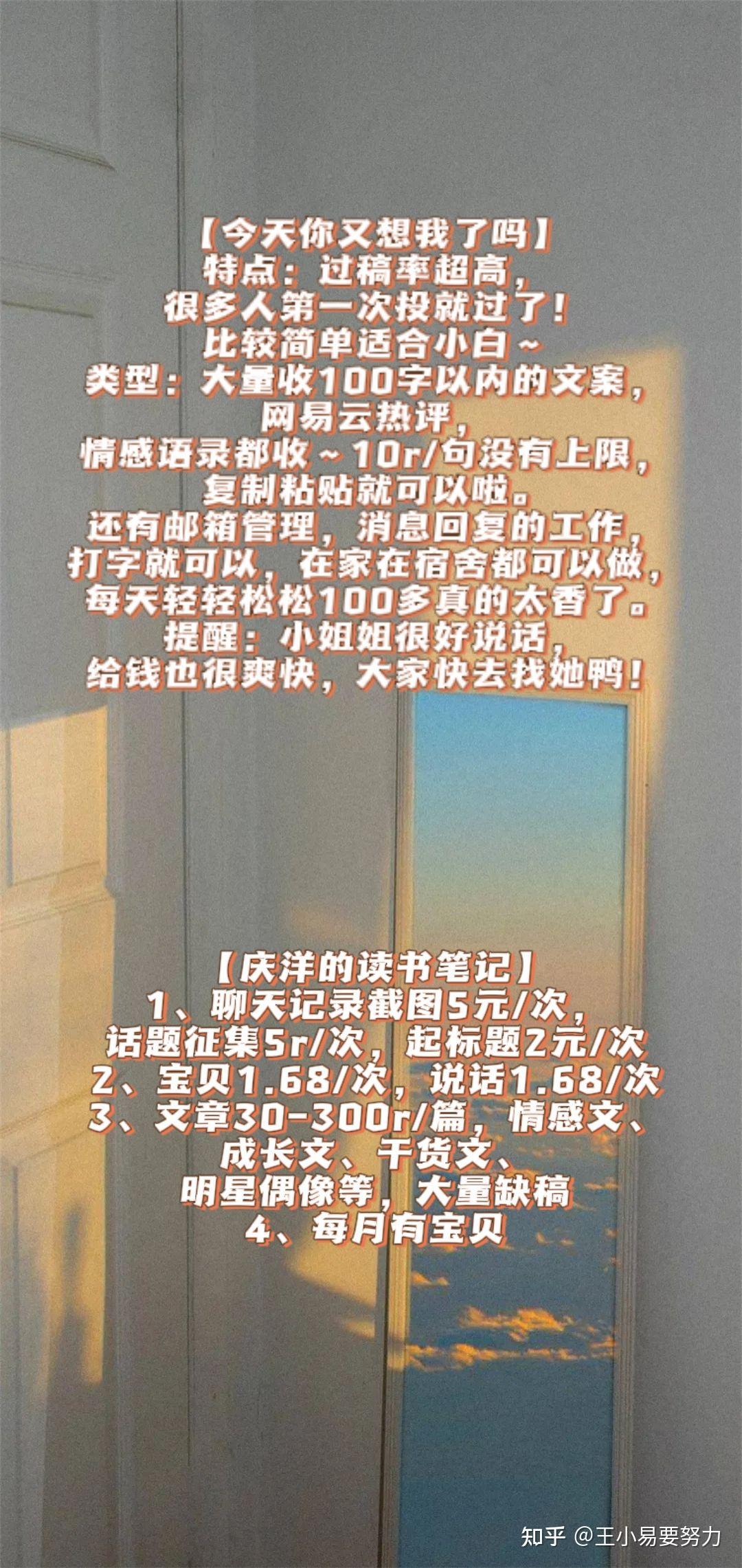 类型:大量收100字以内的文案,网易云热评,情感语录都收~10r/句没有上限,复制粘贴就可以啦。还有邮箱管理,消息回复的工作,打字就可以,在家在宿舍都可以做,每天轻轻松松100多真的太香了。