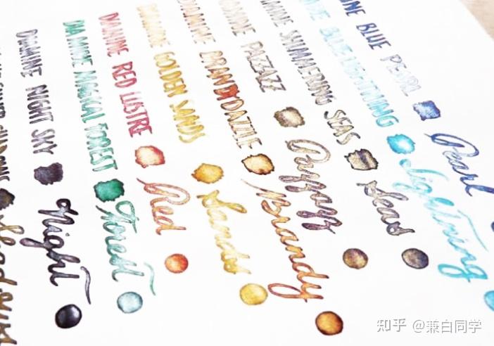 戴阿米旗下的灵光源泉系列是少能装入钢笔中使用的闪粉墨水。闪粉彩墨值得是在彩墨中加入闪粉,让书写字体展现出闪烁的光芒,并且闪光粉可以和墨水不同色,这样就更大的可玩空间。 这类墨水,不建议使用在极细笔尖中,易出现堵笔问题,也不要使用在贵重钢笔中,以免造成不可挽救的后果;建议使用在欧系的F尖以上的钢笔,相对堵笔率低一些,并且也要勤洗笔!