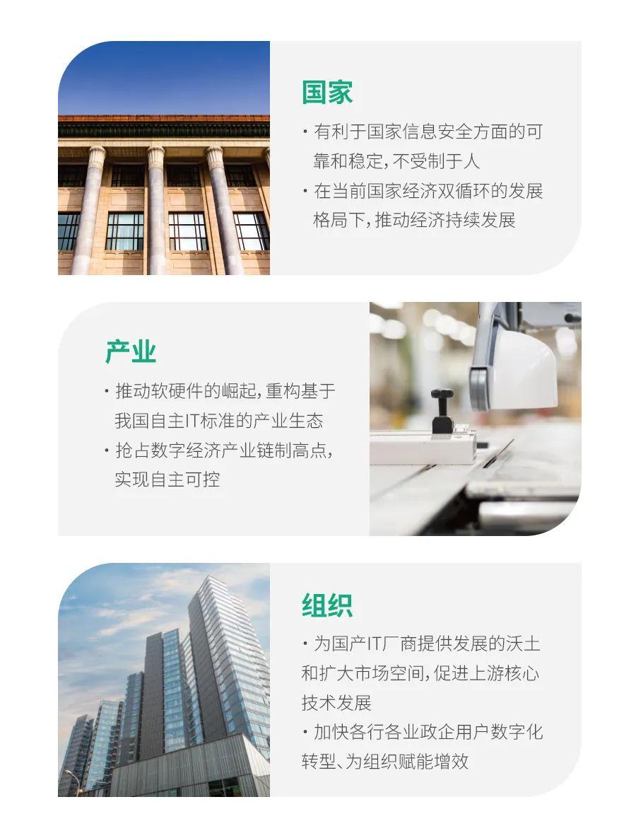 过去中国IT底层标准、架构、产品、生态大多数都由国外IT商业公司来制定,由此存在诸多风险。