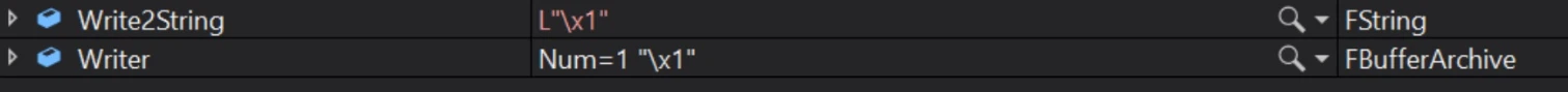 FArrayReaderPtr、FBufferArchive和FStringFArrayReaderPtr、FBufferArchive也是UE4中特有的类,不过放在这里介绍,是因为它的转换以uint8*为基础进行的。将FArrayReaderPtr或者FBufferArchive转FString,先将FArrayReaderPtr或者FBufferArchive中的内容拷贝到uint8数组中,再通过上面介绍的方法从uint8数组转FString;如下,FBufferArchive对象Writer存放的是\x1,16进制的1,也对应ASCII码的编码1,转换为FString对象Writer2String后,也是\x1;