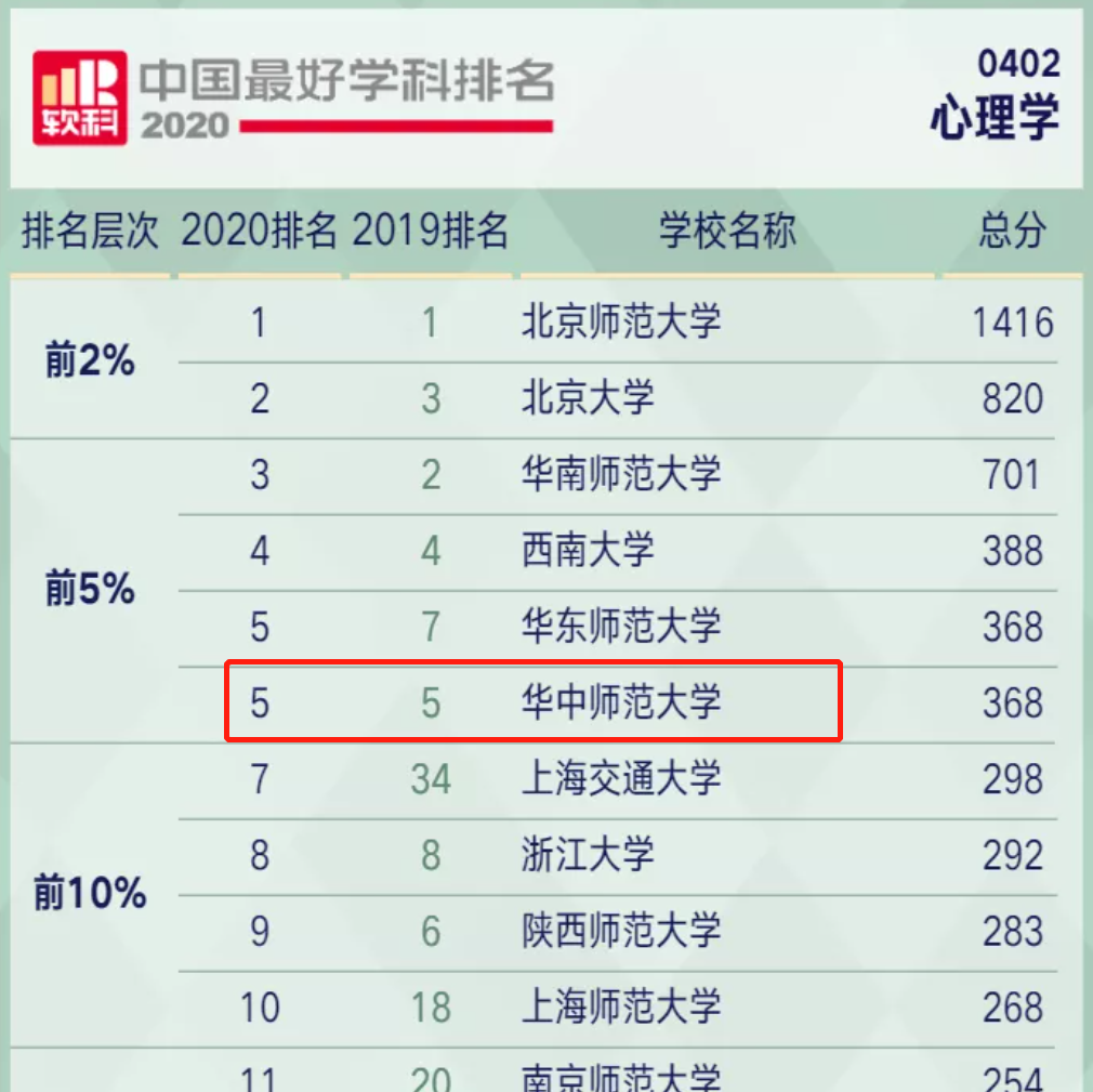 全国第四届学科评级B+,2020年软科中国最好学科排名中位列全国第5。华中师范大学心理学院的办学历史可以追溯到1924年成立的华中大学时期,至今已有逾90年的历史。1984年开始招收基础心理学硕士研究生,1985年恢复本科专业,2003年获得发展与教育心理学博士点。2005年成立心理学院并获得心理学一级学科博士学位授予权。2008年获批湖北省心理学一级重点学科,并成为国家教师教育“985”优势学科平台重要组成部分。先后建设了人的发展与心理健康湖北省重点实验室、湖北省青少年心理健康教育中心、青少年网络心理与行为教育部重点实验室、国家级心理学实验教学示范中心、国家级心理与行为虚拟仿真实验教学中心等重要学科发展平台。2015年12月获批成立中国心理学会网络心理学分会,成为挂靠单位。