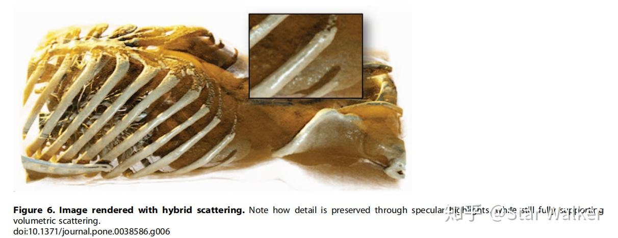 既然电影渲染相比体绘制渲染有明显的突出优势,那么问题来了,是什么神奇魔法让电影渲染拥有这些优势?这篇综述中给出了一个概况性的,但很好理解的解释。这个神奇魔法就在于不同的图像生成方法。简单来说,传统的体绘制图像中每一个像素,都是通过追踪一根单一光线来生成的;而电影渲染图像中的每一个像素都是通过模拟成千上万个光子的运动轨迹后生成的。这些光子来自四面八方、相互作用,共同决定了电影渲染图像中每个像素的值。因此,反过来说,电影渲染图像中的像素值,不仅包含了空间相邻结构的信息,而且包含了所经历的空间媒介(相当于空气)的信息。