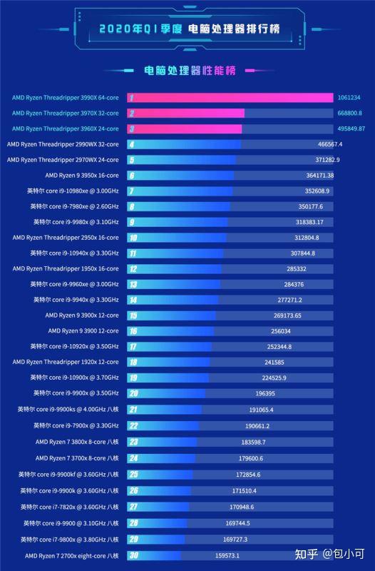 下图所示就是鲁大师制作的最新处理器性能排行榜,排行第一名的处理器是AMD的ryzen 3990x 64-core,以1061234的高分夺冠,不愧是目前最好的处理器。